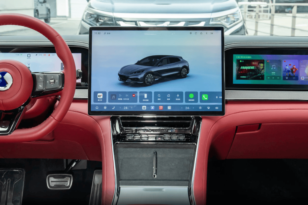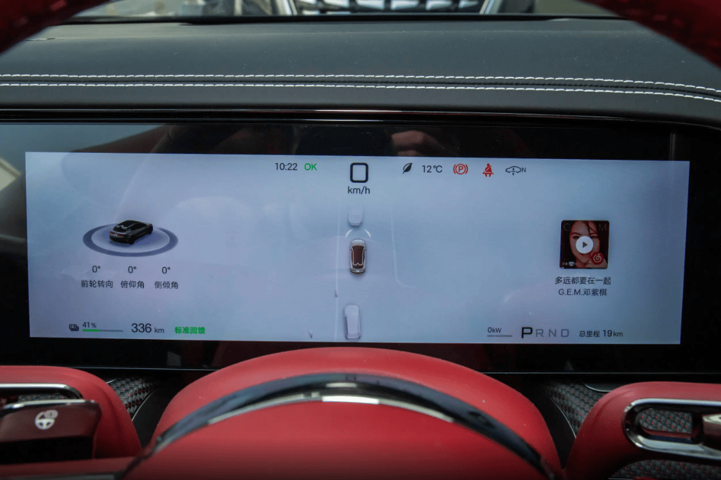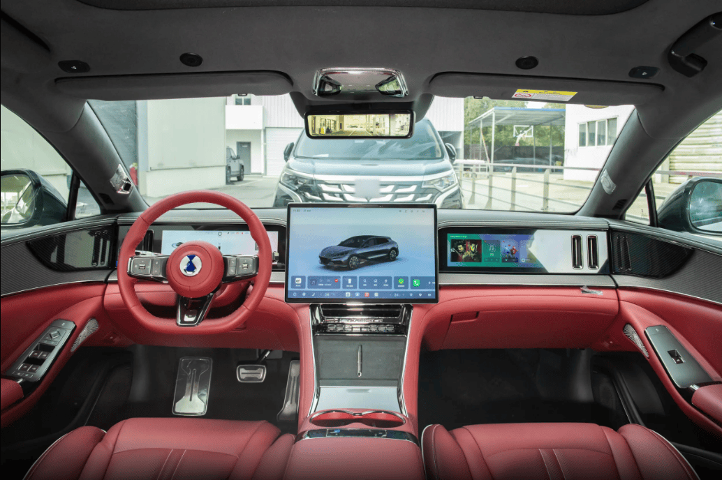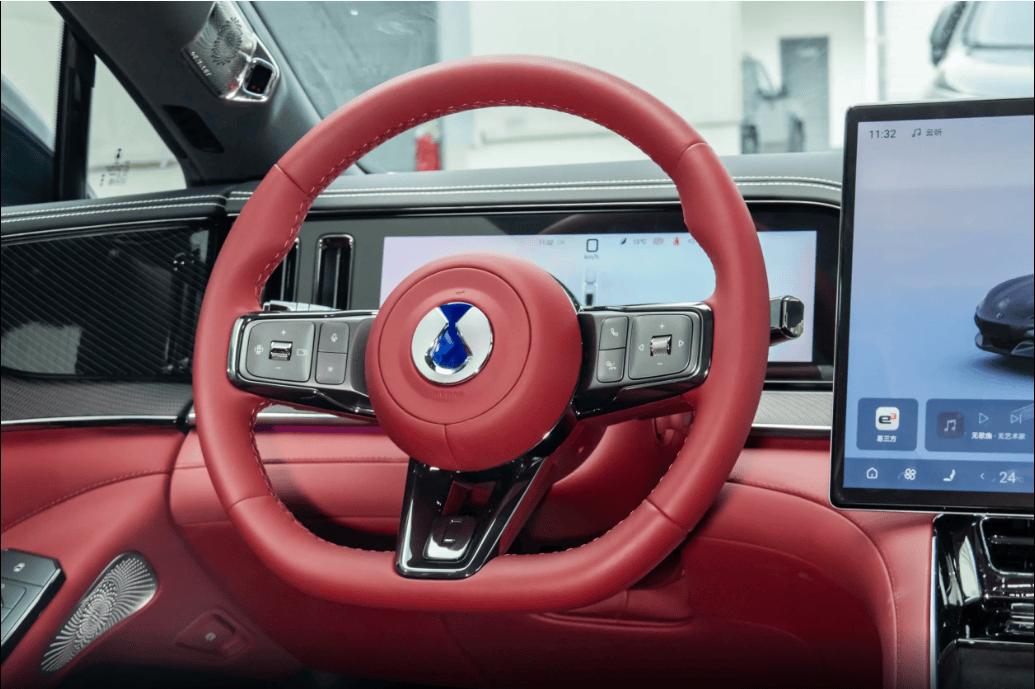 坐进车内就能明显感觉到,这台车的内饰完全是走豪华家用路线,跟那些糙乎乎的工具车完全不是一个路子,质感一上手就很高级。它有熔岩红、穿雾灰、踏雪白三种内饰颜色可选。我个人很喜欢熔岩红,配上真碳纤维饰板,运动氛围直接拉满;另外两个灰色和白色就更稳重,家用、商务都很合适,能满足不同人的喜好。