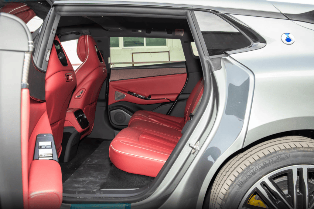 它这套是一体式运动座椅,人机工程学做得挺到位,支撑性和包裹感都在线,就算开长途也不容易腰酸背痛。前排电动调节、座椅记忆、加热、通风、按摩全都配齐了,副驾还有零重力模式,跑高速的时候躺一躺,疲劳感直接少一大截。整体豪华感也很到位,迎宾光毯、智能电动门都安排上了,靠近解锁光毯自动铺开,电动门轻轻一拉就自己打开,仪式感和实用性都拉满。