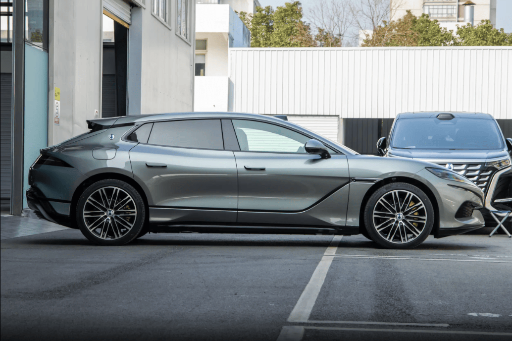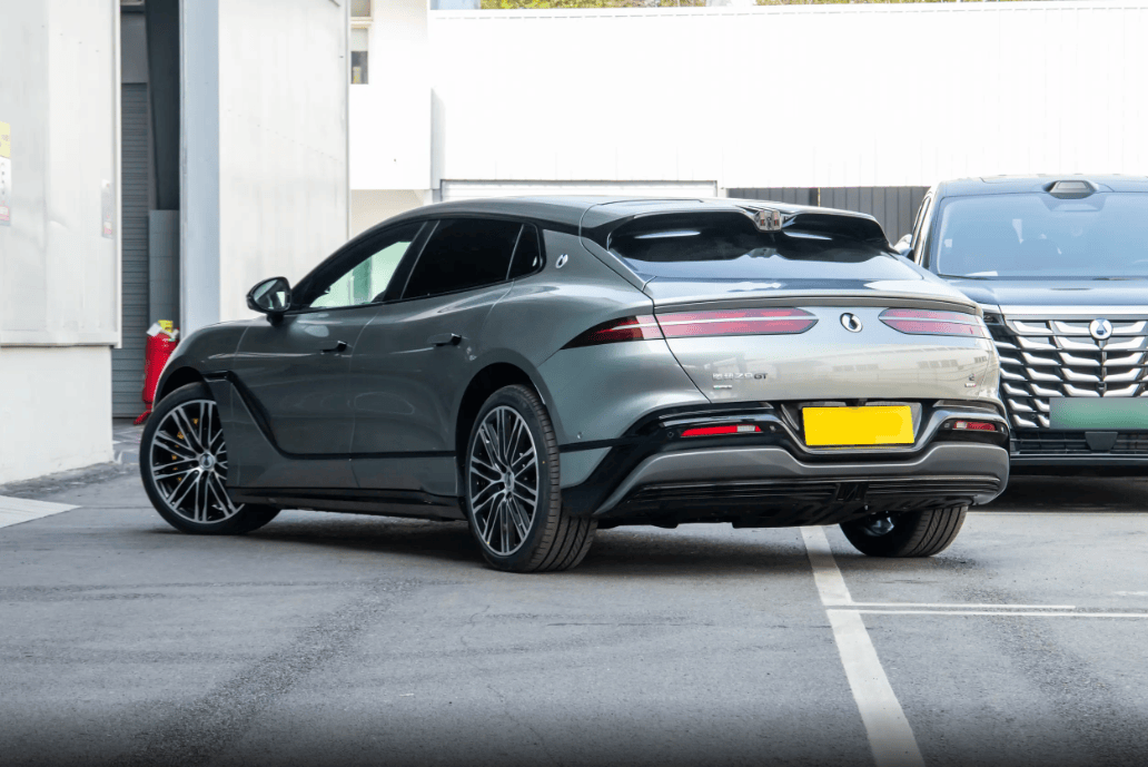 整车姿态低趴又修长,5米1多的车长配合大溜背,比例特别舒展,停在那就有蓄势待发的感觉。侧面Z字腰线很有力量感,搭配隐藏式门把手,线条一气呵成,风阻做得很低,看着顺滑还能帮着省续航。多辐式大轮毂配上黄色卡钳,运动感一下就出来了。除此之外,车尾是时光沙漏尾灯+电动双尾翼,速度上来尾翼自动升起,气场直接拉满,掀背收尾很利落,既有轿跑的凌厉,又有旗舰车的稳重。