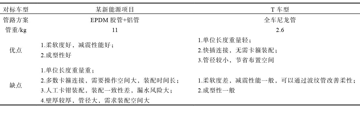 通过竞品对标分析,整车上胶管和尼龙管方案优缺点,如下表所示。某新能源项目和胶管、尼龙管综合对比