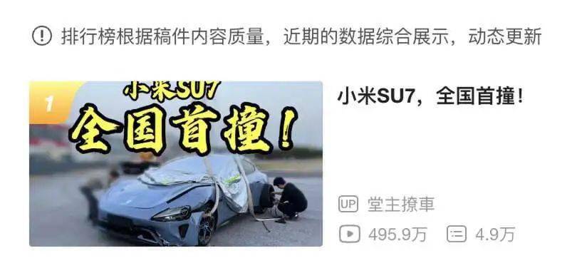 比如截止完稿 B 站全站排行榜第一的视频“小米 SU7,全国首撞”。