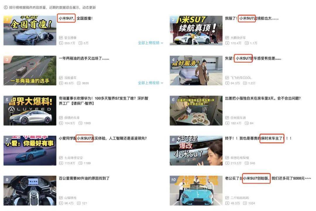 好家伙,整体热度排名前十的视频里,有超过一半的题材是小米 SU7。