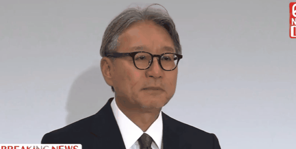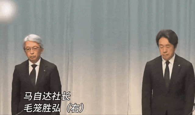 第三张图是马自达的社长毛笼胜弘。他们都在召开记者会道歉,所以才鞠躬。