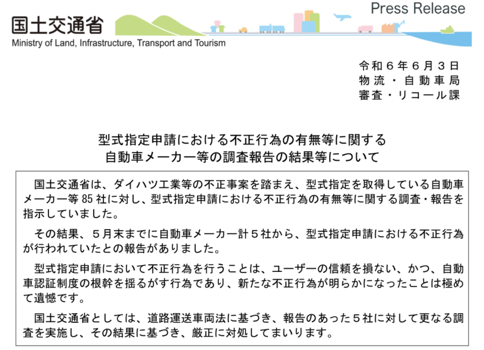 6月3日,据日本国土交通省通报,截至5月底,丰田汽车、马自达、雅马哈发动机、本田技研工业和铃木共5家公司,在车辆性能测试等方面存在不当行为。