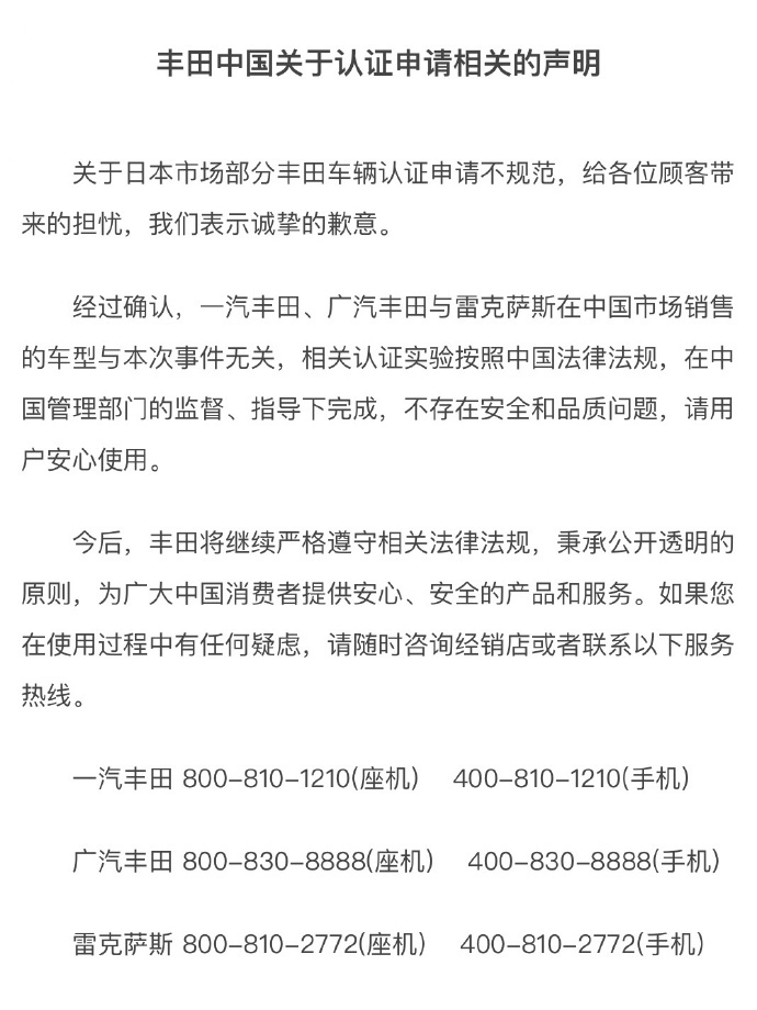 丰田中国也立马回应:经过确认,一汽丰田、广汽丰田与雷克萨斯在中国市场销售的车型与本次事件无关,相关认证实验按照中国法律法规,在中国管理部门的监督、指导下完成,不存在安全和品质问题。