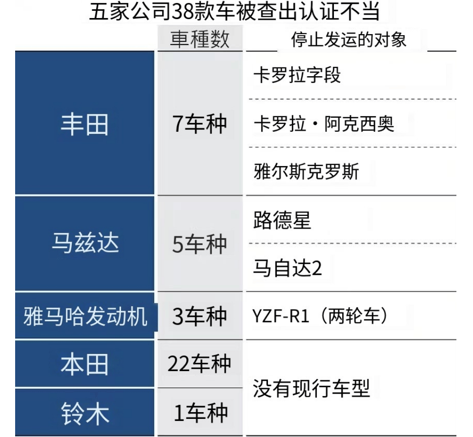 目前,日本国土交通省已要求存在违规行为的3款丰田汽车、2款马自达汽车以及1款雅马哈摩托车暂停出货,并将对上述车企展开进一步调查。