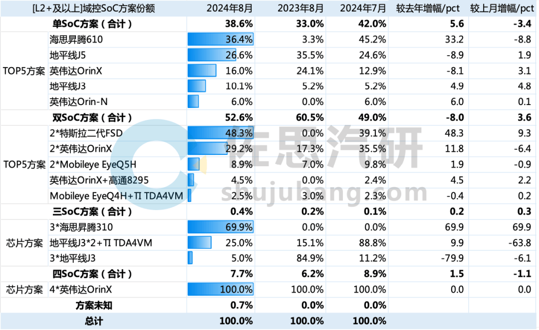 分月度看,2024年8月L2+及以上域控主芯片中:单SoC方案主要采用海思昇腾610,代表车型为问界M9、问界M7等;