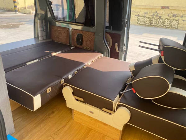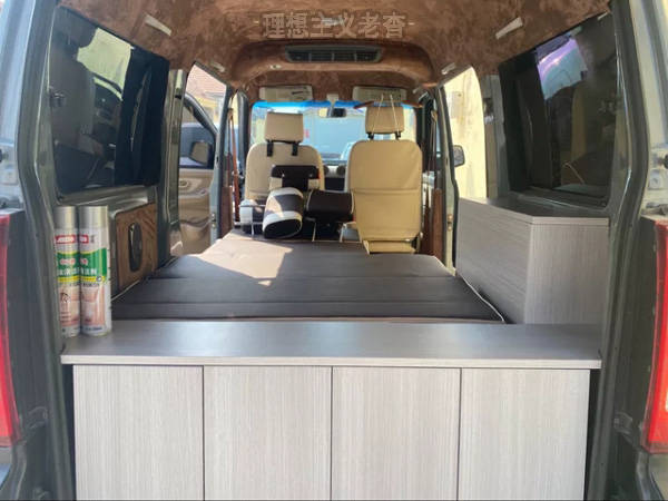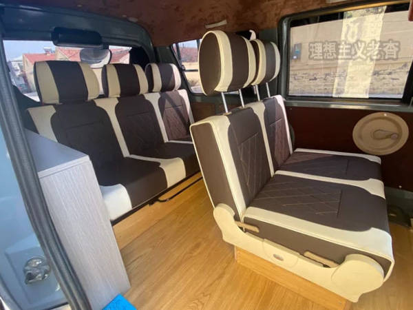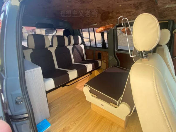 打开右中门,车内实木打底,中后排座椅换成了床车专用椅,现处于行驶模式。
