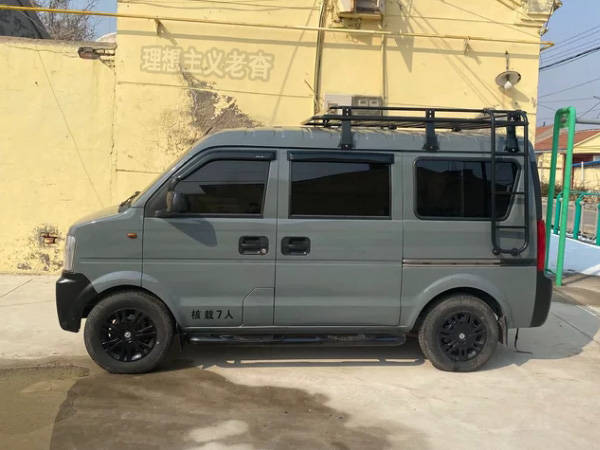 这是一台东风小康V27,1.3L排量,手动5挡,5门7座,通身青灰色车漆,车顶加装了行李架,左尾配备了爬梯。