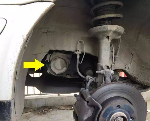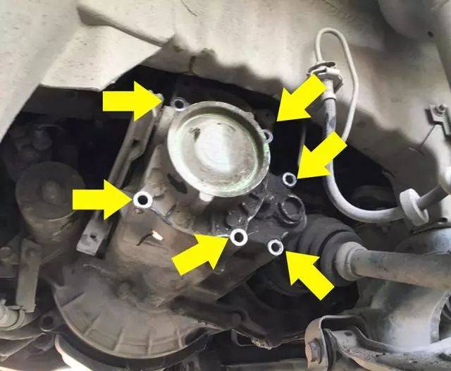 下图黄色箭头是需要拆装的螺丝,只需要把右前轮胎拆下来就可以了。就能看到变速箱端盖。总共6个螺丝。
