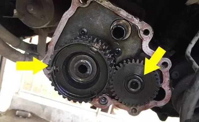 下图是端盖拆下来后的样子。两个黄色箭头所指的就是需要更换的两个齿轮,一个同步器一个五档轮。