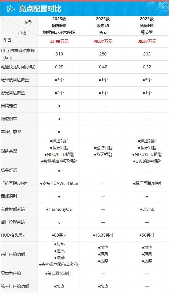 其实在40万左右的价格区间内,消费者可以选择的大型新能源SUV并不多。经过筛选,我们最终选择了理想L9、腾势N9这两款热度颇高的同级产品,对比看看问界M8表现如何。