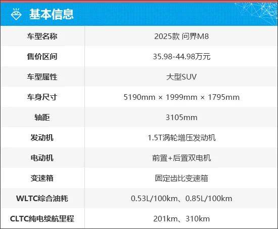 2025款问界M8共推出6款车型,售价区间为35.98-44.98万元。同时,官方还推出了预定权益可叠加、ADS高阶功能包补贴、舒享用车大礼包等购车权益(详情请咨询当地经销商)。新车全系标配双目前方感知摄像头、2个激光雷达,配备HUAWEI ADS辅助驾驶系统。