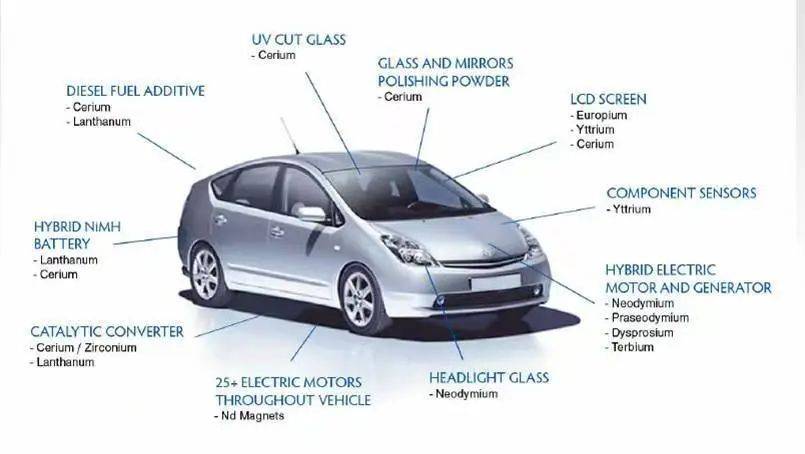 稀土包括17种矿物,汽车用稀土主要包括钕、钐、镝、铈、钆、镧、镥、镨、铽和钇等强磁性元素,被应用于汽车电动机、传感器、转向系统、燃油喷射系统、催化转化器、再生制动系统等零件。