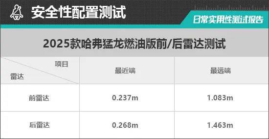 前驻车雷达最远可在1.083m处感应到前方物体,雷达功率表现可圈可点,持续蜂鸣提示距离为0.237m,表现与同级别车型测试均值基本一致。