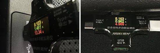 在车内USB接口方面,评测车前排配有1个Type-A和1个Type-C接口,后排有1个Type-A接口。2个12V电源接口分别位于车内前排和后备厢内,并且后备厢还配备了1个220V电源。此外,我们对USB接口进行了测试,Type-C接口的充电功率为13.34W左右;两个Type-A接口的充电功率为4.969W左右。
