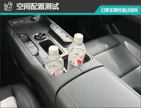 对于车内使用空间的测试,只针对前排触手可及的空间,不包括手套箱、中央扶手箱等需开启的空间。测试方法是将以下固定物品全部放置在前排的各个储物空间内,通过固定物品的放置情况来判断车辆储物空间的表现。测试选定的固定物品为:2瓶常规大小的矿泉水、1部大屏手机、1支口红、1个挎包、1副墨镜、1把折叠雨伞以及1包常规尺寸的抽纸。