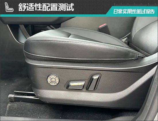 舒适性配置方面,评测车的前排座椅调节按键分别位于座椅左右两侧,位置合理且操作便捷。同时,驾驶位支持3组座椅记忆功能。此外,前排座椅还支持加热和通风功能,舒适性表现可圈可点。