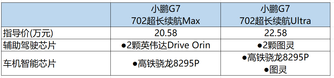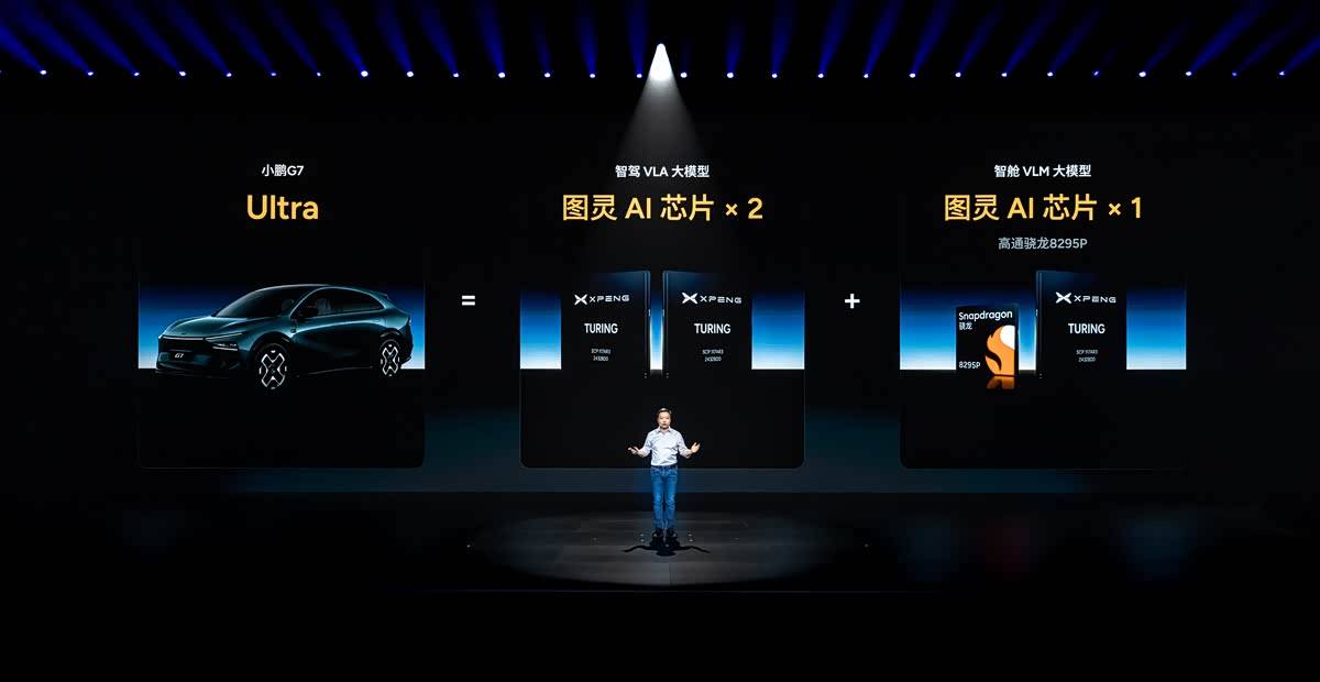 小鹏G7的主要卖点在智能化,核心是小鹏自研的图灵AI芯片,单颗算力超过700TOPS。Ultra车型总共会搭载3颗,其中1颗用在智能座舱,2颗用在智驾辅助之上。