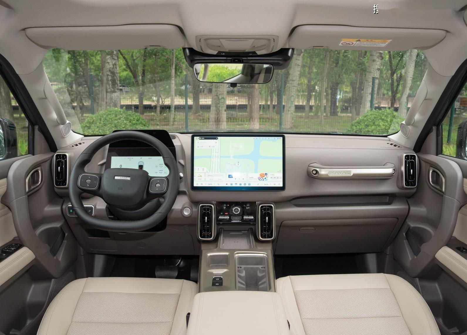 进入车内,全新浅色系的双拼配色个性感十足,中央换装14.6英寸悬浮中控屏+10.25英寸全液晶仪表,搭载Coffee OS 3系统,支持华为HiCar/语音连续指令,8155芯片保障流畅交互。整体造型趋向于大狗二代,副驾驶保留硬派扶手,怀挡设计释放中央通道空间,新增50W无线快充与10扬声器音响系统。座椅采用双密度海绵填充,顶配提供靠背/坐垫双通风,加热速率提升50%,后排腿部空间达860mm。