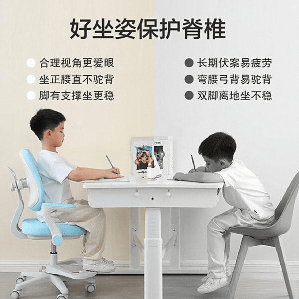 双靠背设计:椅背采用双靠背设计,支持孩子的腰部和背部,让他们在学习时保持端正的坐姿。这个设计非常适合正在长身体的孩子,有效防止驼背问题,帮助他们养成好习惯。