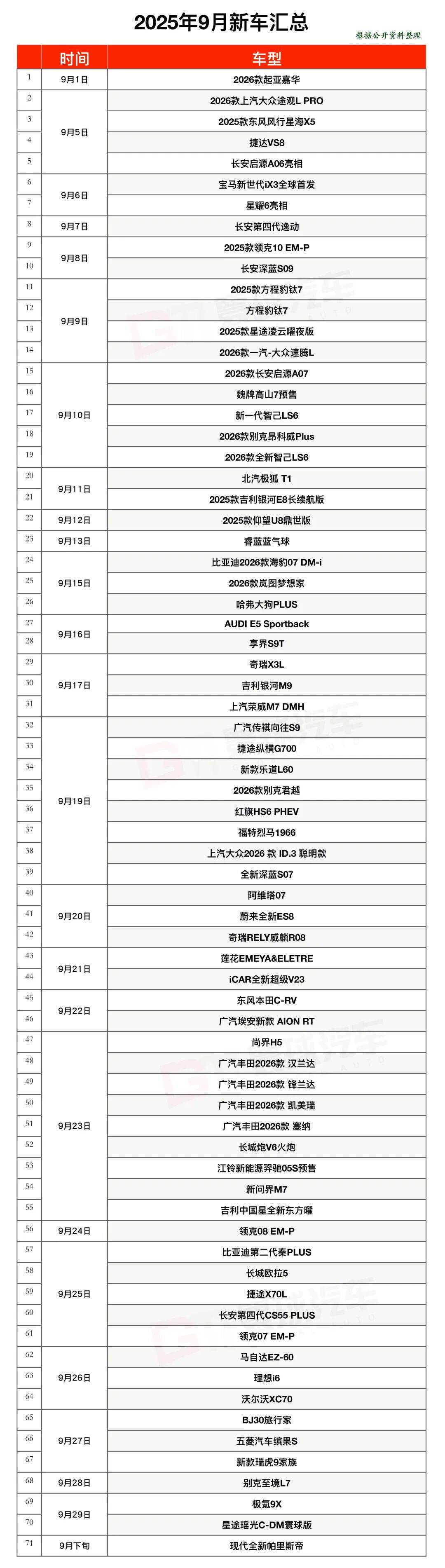 数据是真实的。即便是去年的新能源大热潮下,同期上市的车型也只有不到40台。而即将过去的这个9月,平均每天就有两款新车发布,抛开几个特殊的纪念日前后,几乎天天都有新品登场,累计有超过71辆的新车投放市场。最夸张的黄道吉日,竟然有8台车在中国的各地被推向消费者。