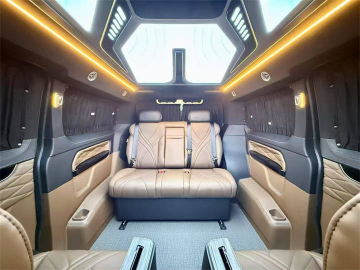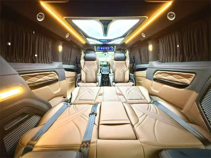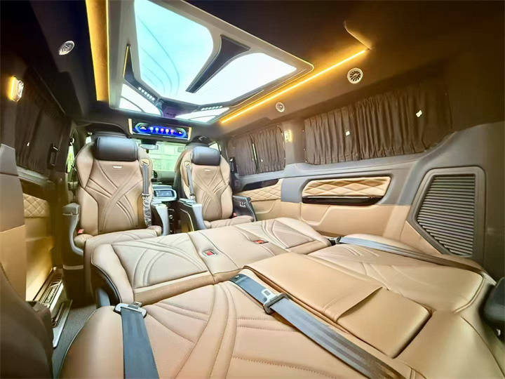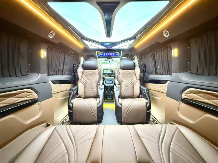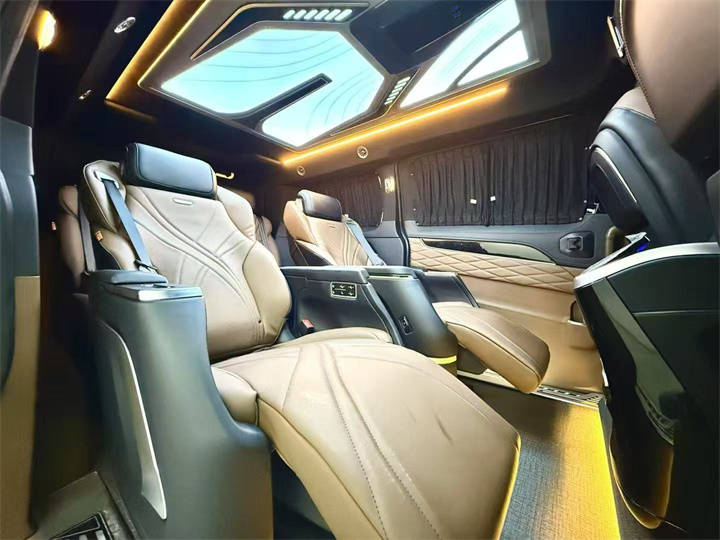 进入到车内,标准的7座商务大布局,2+2+3的款式。整车全部都是豪华的软包,覆盖在方方面面,中央扶手冰箱,车内车载香薰,包括无线充电功能,全部都有配备好。座椅的乘坐上来看,正副驾驶的座椅单独的配备了通风和加热功能,中排的航空座椅,通风加热按摩旋转的功能都有具备,后面的三连排的座椅可以180度的放平,当沙发床来使用,也就是说7个座位,每个位置的乘坐感都是相当不错的,每一排位置都有自己的特色。