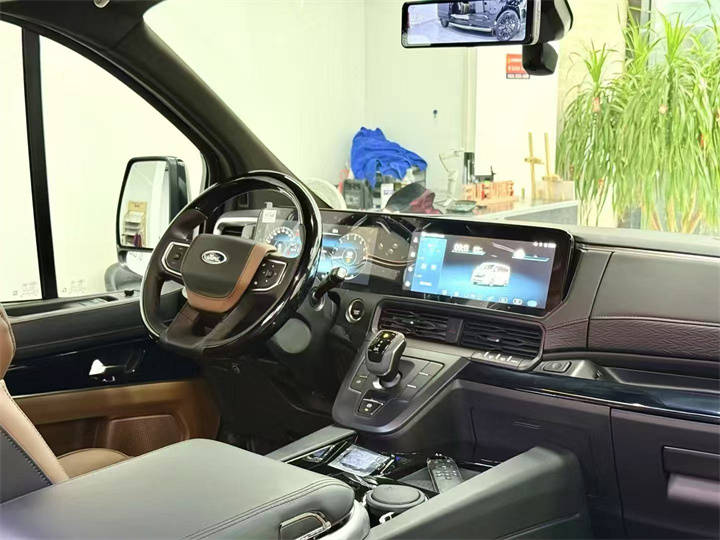 整个车子的长度在5米,车宽在两米,车高在两米,车型是非常方正的,车头比较的短,所以车内部空间非常的大,同级别的车型对比中,像别克gl8,丰田系列都不如它。它带有上下高低4档可调节的空气悬挂,就这个配置在系列商务车中有着绝大的优势。同时像一键启动,无钥匙进入,远程app启动,它通通都有,驾驶室的屏幕也是科技的双联屏。从外观来看,猛禽FORD的大字母中网,非常的时尚,如果当做日常代步车来开,驾驶感受很不错,颜值又高,开出去也有档次。当然如果是商务接待用车或者是家庭用车,它都适合的。