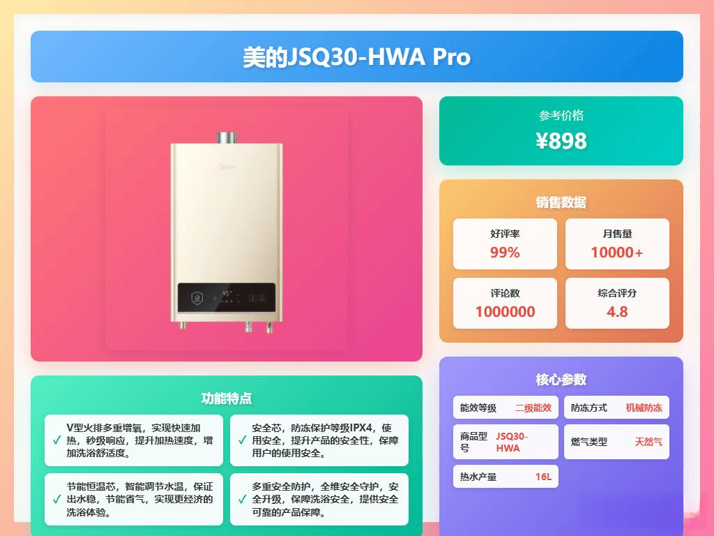 安全方面,美的热水器也考虑到了,具备88重安全防护,开机时会自检,确保没有问题,像防冻、防超温等功能都很齐全,使用起来非常放心,毕竟安全第一。