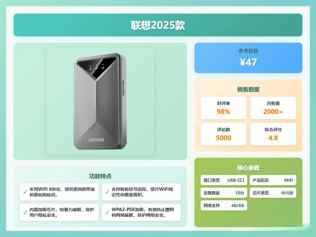 它还支持最多连接10台设备,包括手机、平板、笔记本和智能家居。电池容量为2100mAh,续航可以达到6-8小时,携带轻便,整体设计也挺精致。设备还具备加密芯片保护,确保网络安全,免驱动设计让使用变得更简单,随时随地都能开启网络自由。