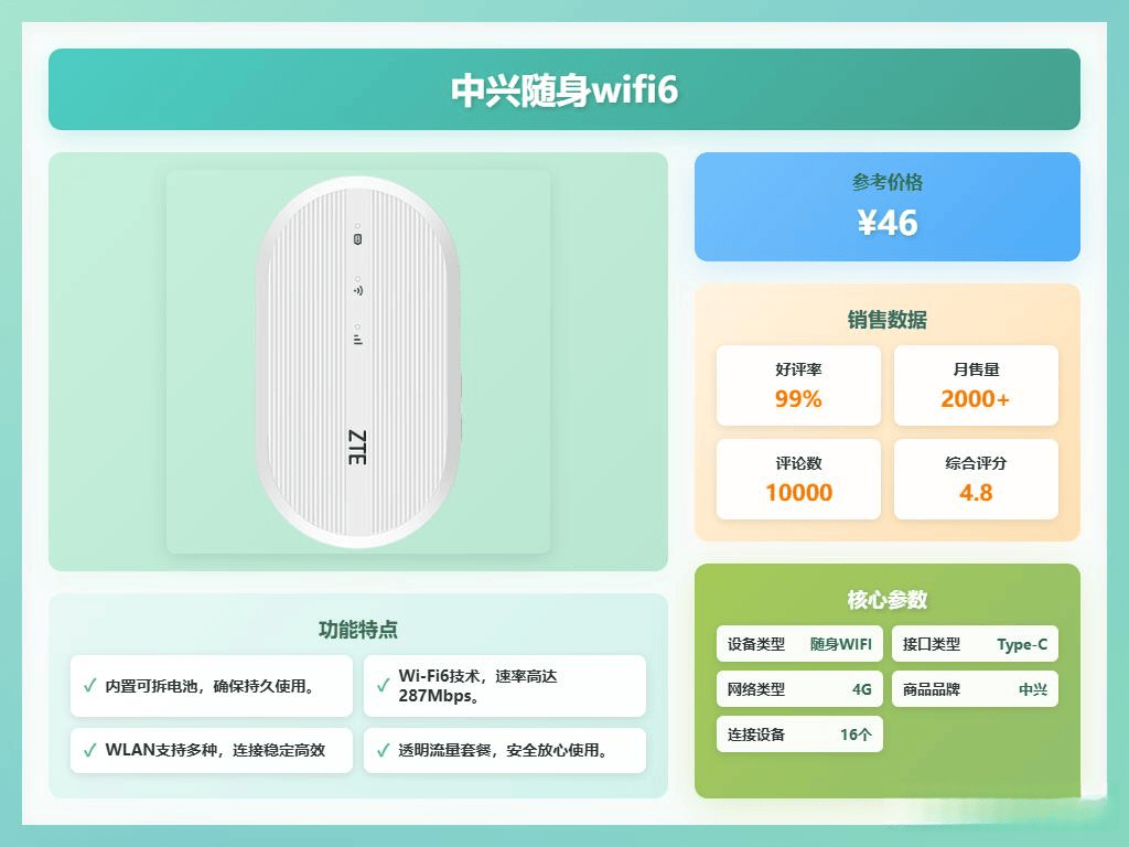 安全方面,内置的防火墙和WiFi隐藏功能,也让人放心,防止蹭网和数据泄露。机身轻巧,放包里或口袋都很方便,随时随地带着出门上网。连接也挺简单,无需驱动,直接插上数据线就能让电脑联网,确实挺方便的。