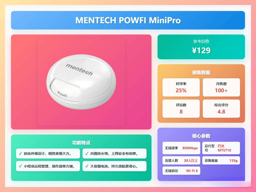 MENTECH POWFI MiniPro采用了先进的5G技术,配合Wi-Fi 6协议,能实现150Mbps以上的无线速率,在网络速度方面表现相当不错,基本能满足日常的浏览和流媒体需求。它内置的巴龙5G芯片,不仅提升了连接效率,还降低了能耗,让长时间使用变得更稳定。没有插卡的设计,让使用更简便,无需担心SIM卡的兼容问题,适合需要随时随地上网的朋友。