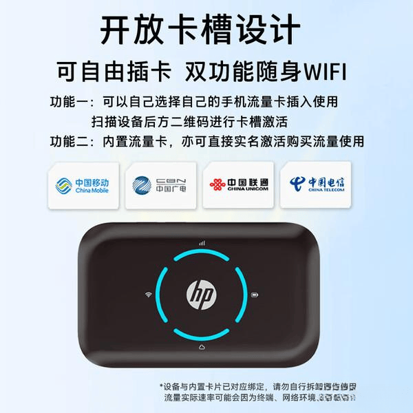 惠普这款随身Wi-Fi支持多种使用方式,用户可以插入流量卡,享受无套餐限制的上网体验,也可以选择不插卡,用内置的SIM卡进行连接,操作都相当方便。设备内置天线,支持4G网络,确保基本的网络连接需求,适合临时出行或户外使用。连接简单,只需开机等待几秒,自动识别网络,几台设备同时连接也不成问题。