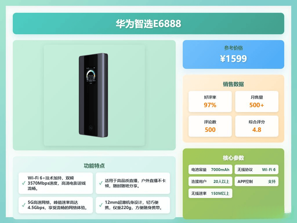 华为智选E6888支持5G-A网络,能够带来比4G更快的速度,峰值速率高达4.5Gbps,让你在外也能畅快上网。无论是高清视频播放还是大文件下载,都毫无压力。除了5G,它还兼容4G网络,确保在没有5G信号的区域还能稳定连接,基本没有卡顿感。