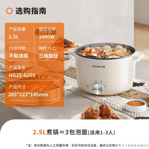 在选购九阳小电锅时,首先要考虑容量。如果你是单身或小两口,1.5L-2.5L的容量就足够了。像九阳HG25-G201S和HG25-G201这两款2.5L的电锅,煮面、烫菜、甚至简单炒菜都能轻松应对,空间也足够。