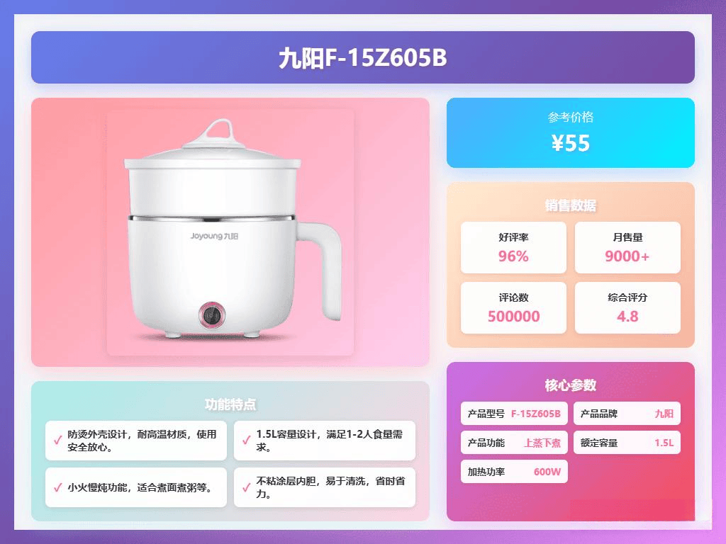亮点:1.5L小容量、多档火力调节、不锈钢内胆、可蒸煮双模式