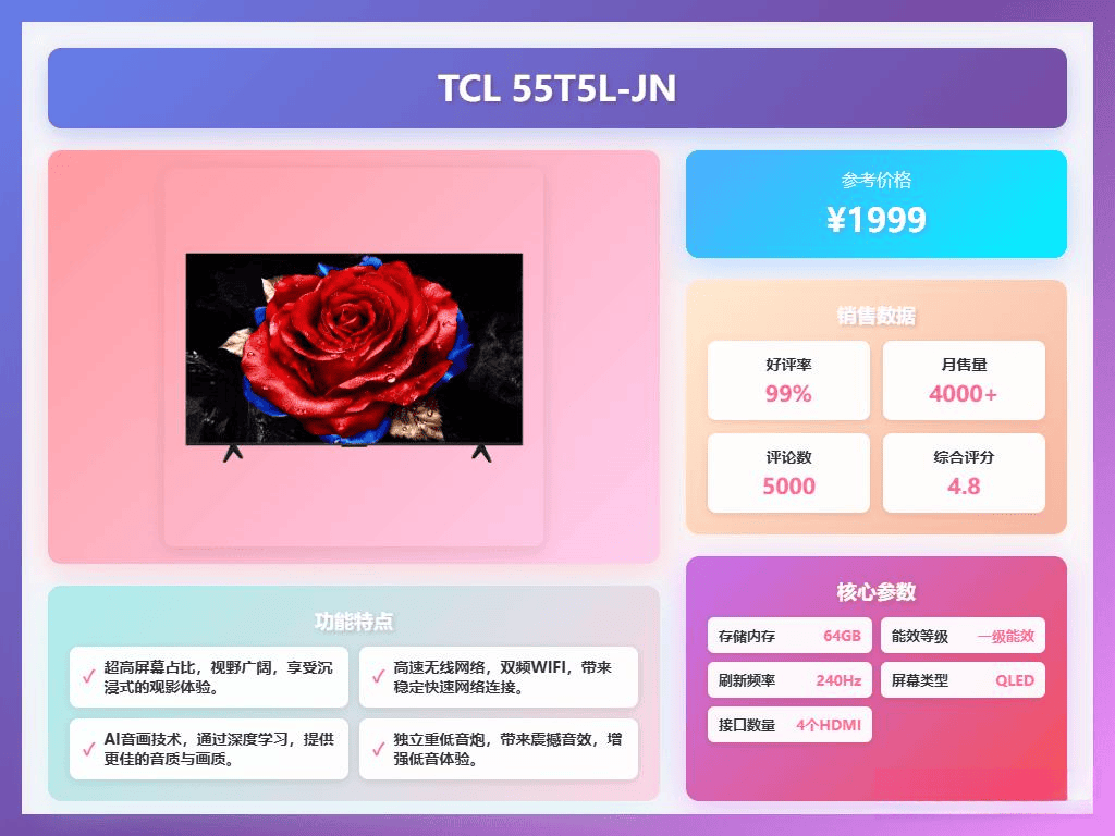 薄如蝉翼的设计,厚度更少,8mm超薄挂架轻松挂墙,金属边框走简约路线,既高端又好看。还支持智能双频WiFi 6,网络连接快如闪电,追剧、游戏不卡顿,体验感还挺稳。当然,AI语音助手“小T”,想问啥都能秒答,操作变得更简单,家庭娱乐变身智能生活。