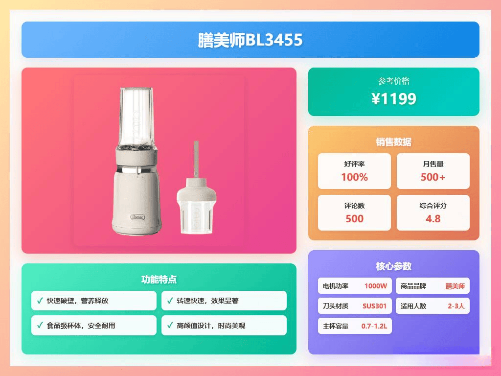 - 优点:功能强大,用途广泛;能够充分释放食材营养;制作出的饮品口感细腻;清洗相对方便。