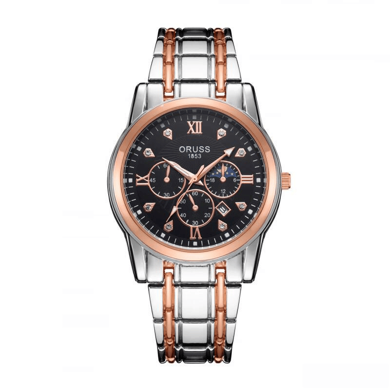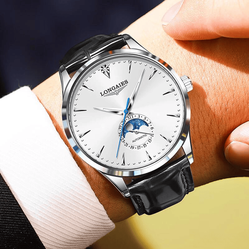 镜面经过精细抛光,透明度很高,看时间一目了然,不会有模糊或反光问题。这表的表壳用的是316L精钢材质,坚固又耐腐蚀,平时运动、出汗都不用担心损坏。表带是真皮材质,手工包边,触感柔软,结实耐用,而且经过上千次弯曲测试,不容易断。双蝴蝶扣设计,佩戴取下都很方便,也很牢固。它还能应对日常生活,比如50米防水,雨天、洗手、洗车都没有压力。月相、日期、夜光指针和三楼梯时标,既实用又具备一定的装饰效果。整体尺寸为42毫米直径,适合大部分男士手腕,是个稳妥又有档次的选择。