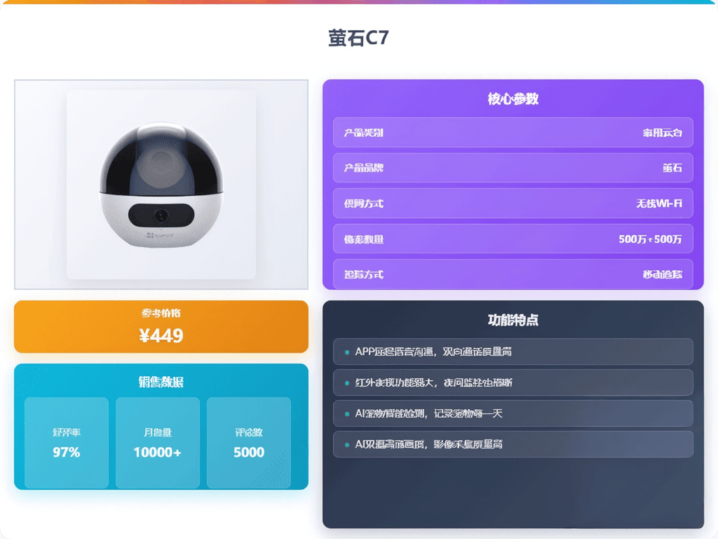 这款摄像头是萤石系列中的一款明星产品,具备以下几个显著特点: