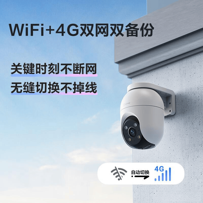 - 双网络连接:萤石C8C支持Wi-Fi和4G无线双网络连接,用户在没有Wi-Fi的情况下也能通过4G网络进行监控,确保监控不断线,适应各种场景。