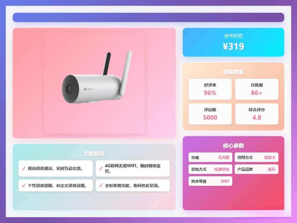 - 4G网络连接:支持4G流量功能,用户只需插入SIM卡即可使用,随时随地监控家中或店铺。