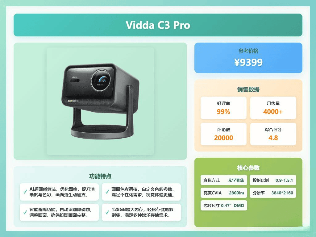 推荐理由:Vidda C3 Pro投影机值得一试。4K超高清分辨率带来清晰细腻的画面,无论是看电影还是玩游戏都特别过瘾。它的三色激光光源使得色彩表现更加鲜艳,画面更逼真,色彩过渡自然,饱满且不易失真。