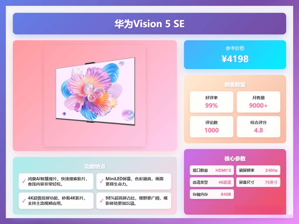 如果你在寻找一款更大的电视,华为75英寸的Vision智慧屏5 SE绝对值得考虑。它配备了MiniLED背光技术,峰值亮度可达1000尼特,动态对比度高达125000:1,画面层次感丰富,色彩表现真实。支持HDR和鸿鹄HDR增强技术,明暗部分的细节表现也相当出色。