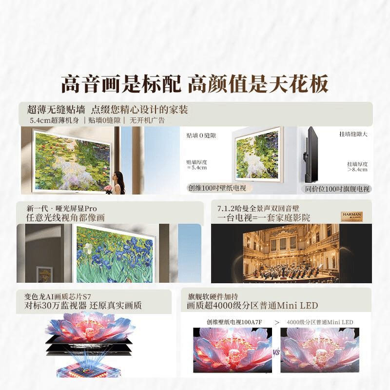 最后,我想给大家一些掏心窝子的建议:如果你家客厅墙面平整、承重没问题,又想要一台既能当艺术品又能打游戏、看大片的百英寸巨幕,那创维100A7F绝对是2026年初最值得入手的大屏电视之一。现在国家补贴政策还在持续,叠加年货节促销,价格处于全年低谷。错过这波,很可能要等到618才有类似力度。