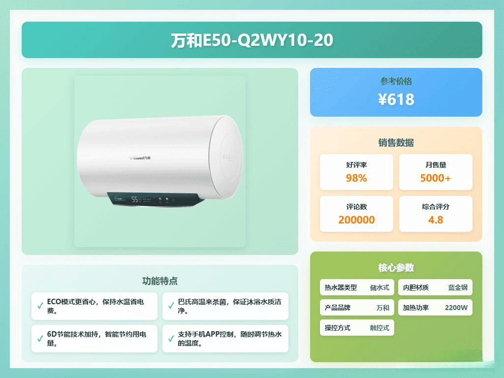万和E50-Q2WY10-20电热水器配备了触控式操作面板,使用起来确实挺方便,即使是家中老人也能轻松上手。它的一级能效等级意味着在日常使用中能有效节约能源,既环保又省电,适合追求经济实惠的家庭。50升的容量基本可以满足大部分家庭的洗澡和厨房用水需求,确保热水供应充足,不用担心高峰时段用水不够。