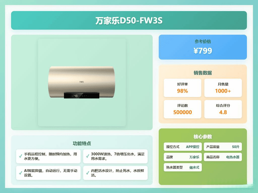 万家乐D50-FW3S电热水器配备了APP远程操控功能,用户可以通过手机随时随地预约加热或调节水温,享受更加便捷的用水体验。内置的一级能效也意味着在保证出水效率的同时,能耗更低,节省用电成本。它的50-59L容量适合家庭日常使用,满足基本洗澡和洗漱需求,而储水式设计确保水量充足,用水更稳定。