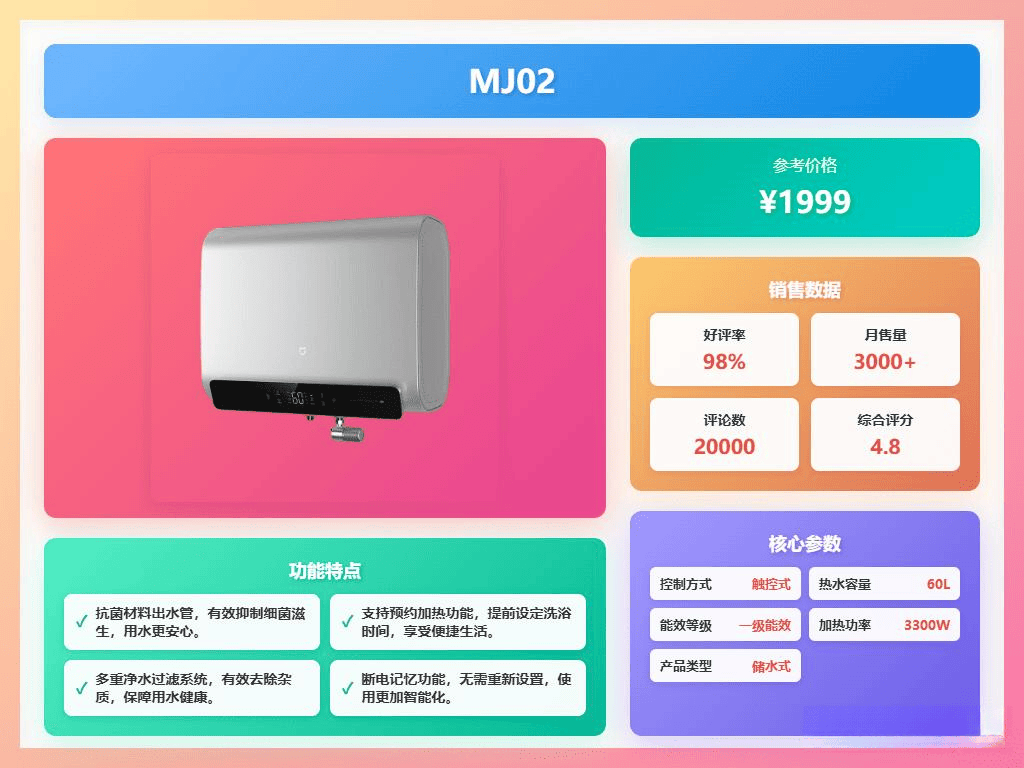 米家MJ02电热水器采用触控式操作,界面简洁直观,彩色显示屏让调节温度和设置变得更方便。它还支持远程APP控制,只需几步就能预约加热或调整温度,无论是在家还是外出都能轻松管理热水供应。这种智能化设计让使用体验变得更灵活,也挺实用的。