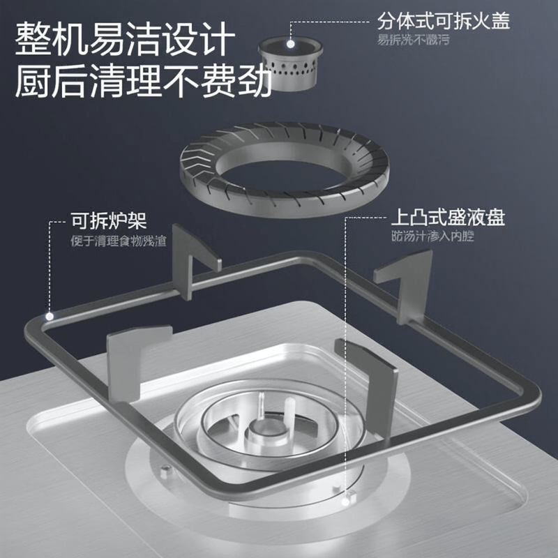 - 易洁易拆:这款燃气灶的可拆卸结构设计,让你轻松打理,溅油溢锅也不怕。餐后两步拆洗,清洁更轻松,无需多费心力,灶具常年洁净如新。这样的设计,让厨房生活更加便捷。