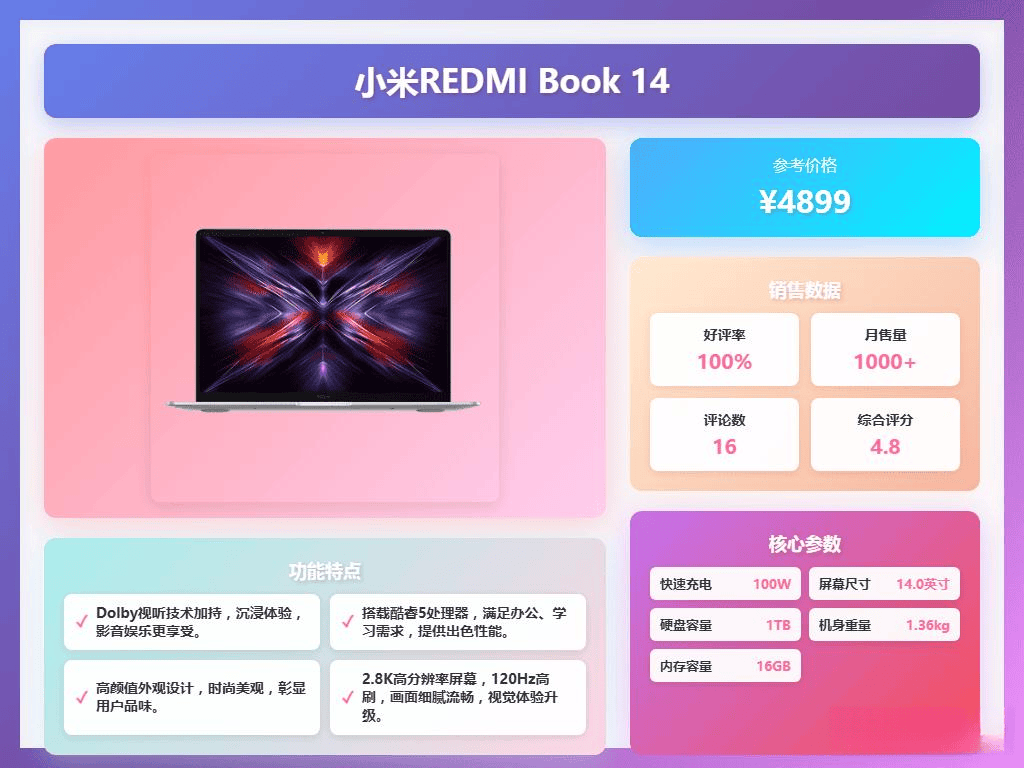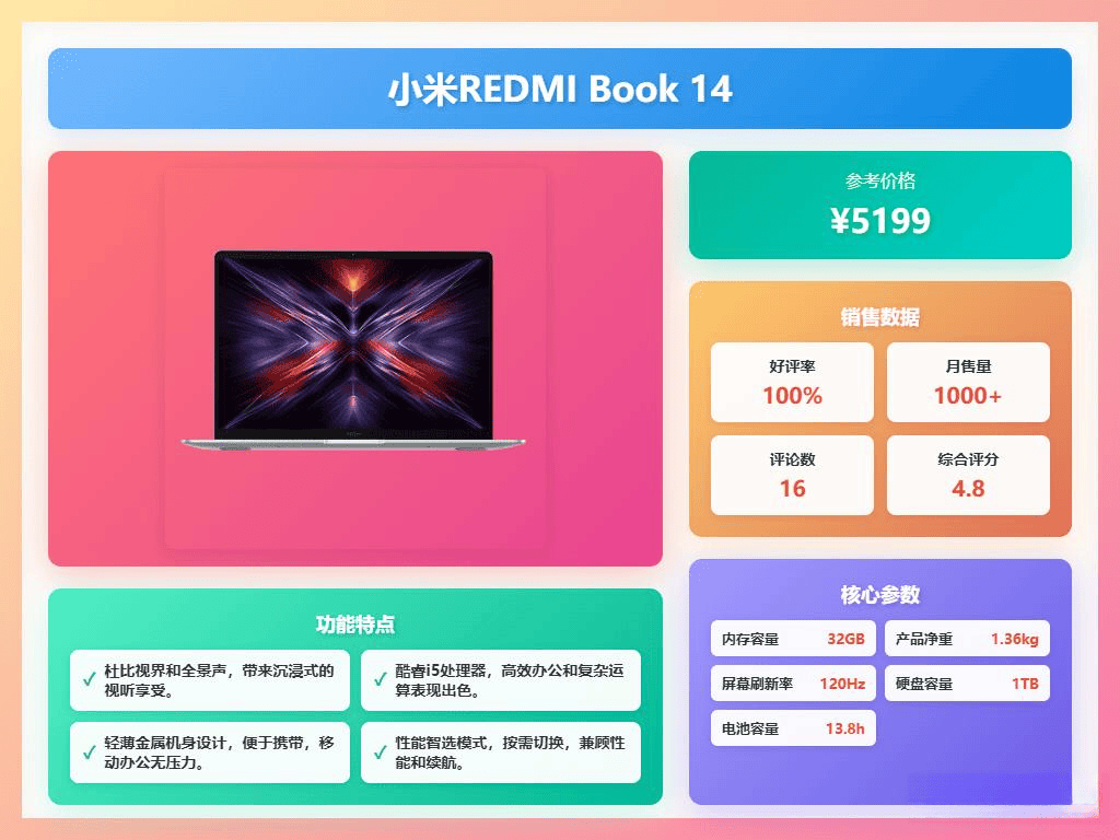 小米Redmi Book 16(2024)采用第12代酷睿i5处理器,日常办公学习毫无压力。16英寸大屏,1920x1200分辨率和100%sRGB色域,显示效果非常出色。机身轻薄,金属质感也不错,携带出门倍儿有面子,用户表示:“颜值很高,爱了爱了!”